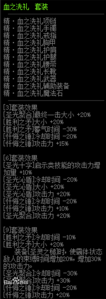 俗称锤盾套,加强忏悔之锤和圣光沁盾,比较多的审判奶爸首选的套装(魔战幽魂豪走开),减少了两个输出不错的技能的真空期,一般做6件就可以了,9件的双盾cd过长,并没有太大的加成,而且浪费的位置较多