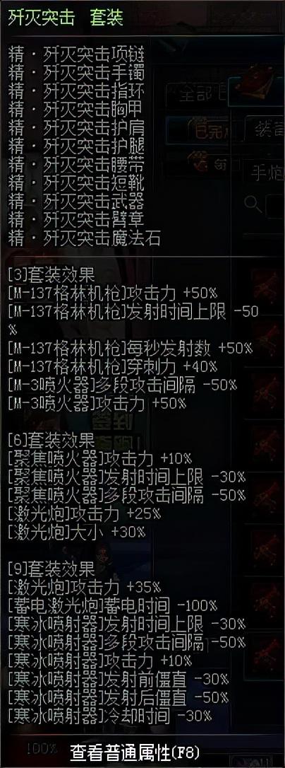 女大枪当时流行的一套,男大枪走光女大枪走火。主要增加聚焦喷火器技能攻击力,并减少技能攻击间隔、攻击时间。是当时小康级别毕业的女大枪首选套装。9件套增幅的寒冰喷射器技能作用不大,因此,首选6件套,搭配黄字、爆伤、魂链等首饰,可以提高很大一部分输出。