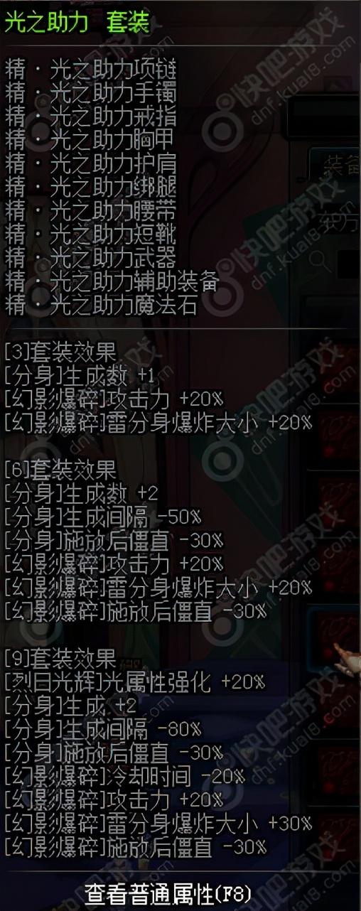 这套装备就是推荐给女气功玩家的了,针对分身技能加成。分身的生成数量增加以及爆炸大小的增加都是非常厉害的,而且烈日光辉的20%光属性强化也是不容忽视的。