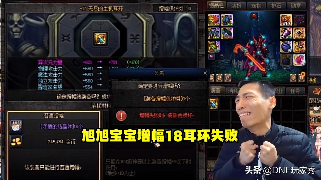 DNF的高增幅成功率为22%,能否成功全看运气,结果就是几家欢乐几家愁。不仅能出现难以置信、不可思议的“旭旭宝宝45连败”和“大嘴80连败”,也能出现“增幅20、增幅21、增幅17连成”等奇迹,“骚白”在增幅时就创造了奇迹。 #DNF十五周年#