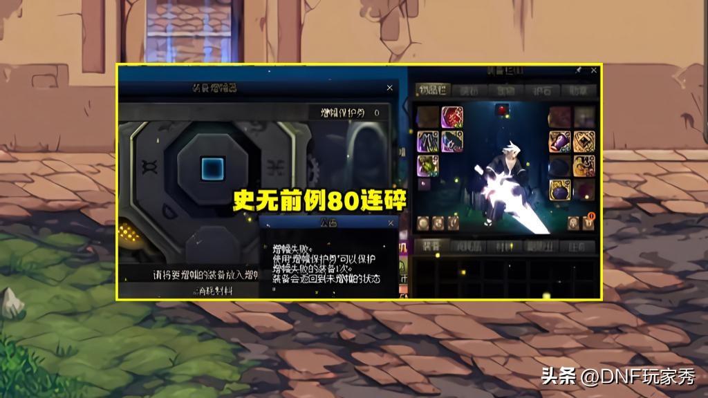 其次,“大嘴”花200万买下红20剑魂后,就开始不遗余力全力增幅“全身16、耳环17”,在最近的一次增幅中,用“11件15、1件16、500件12”冲击,缔造了DNF增幅史上的最夸张的连碎纪录:80连碎!