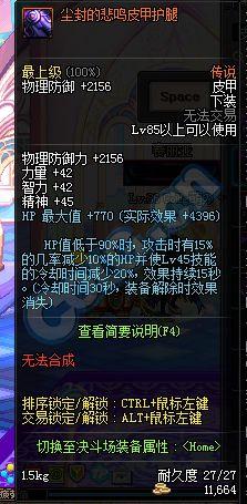 下装:HP+770,HP低于90%时,攻击时有15%几率减少10%HP并使Lv45技能的CD减少20%,持续15s,CD30s,解除装备后失效