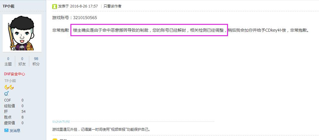 由于在DNF官方论坛进行申诉,迫于压力,官方人员表示进行查询,没想到查询的结果是:确实是误封,已经解除封停。这句话一说,瞬间打脸,因为官方一直强调DNF不存在误封,所有的封停都是因为使用非法软件或者篡改客户端,把责任都推卸给玩家。但是如今承认存在误封,这样的打脸,对自己不存在误封的措词该如何辩解?