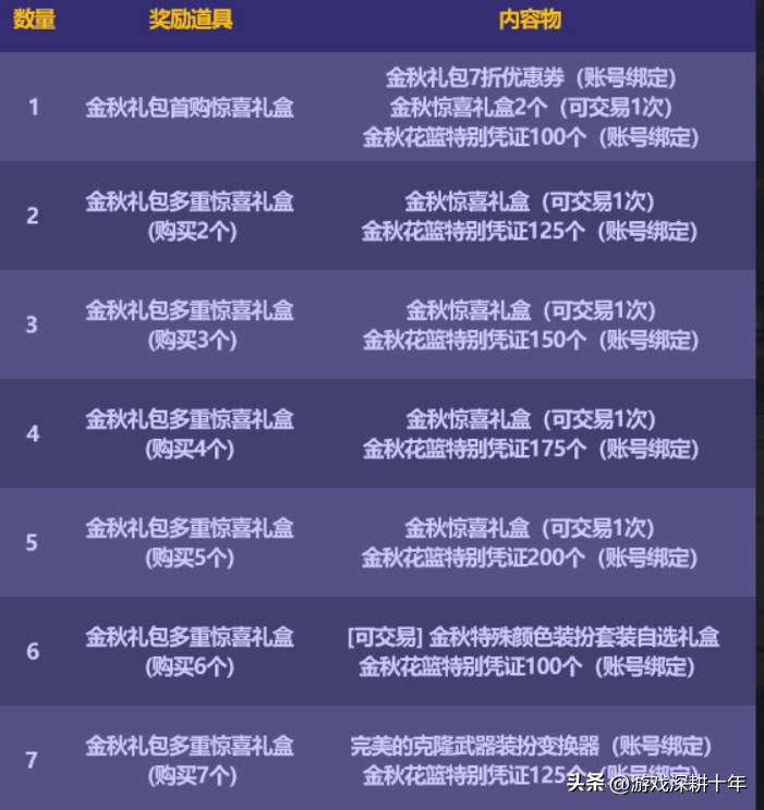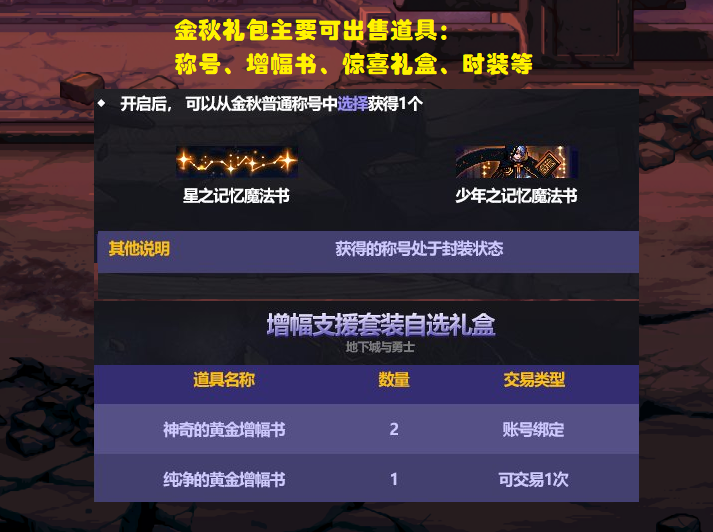今年整个国庆礼包中可出售的道具主要有:黄金书 (每套1个)、称号 (每套1个)、惊喜礼盒 、以及多买多送中的时装 等。