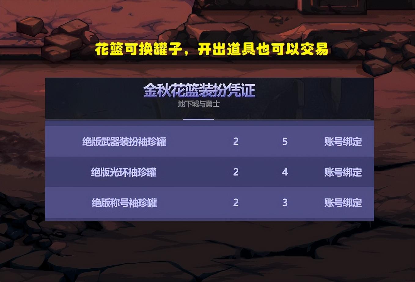 以及最重要的,如果大家对花篮道具 兴趣不大,那么花篮可换“绝版装扮罐子” ,特别凭证可换“账绑惊喜礼盒” (120凭证换1个),所以实际成本应该会比理论计算花费更低!
