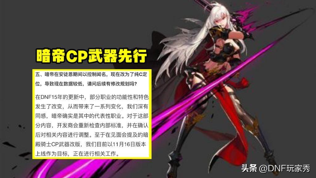 答:暗帝数据低,将持续关注!同时,11月16日版本,暗帝CP武器改版。
