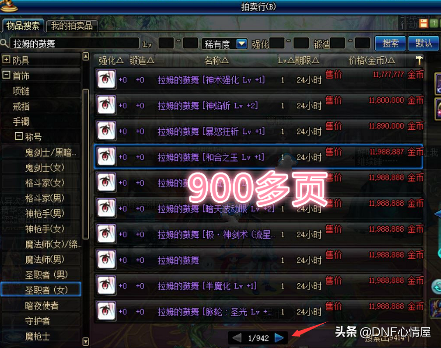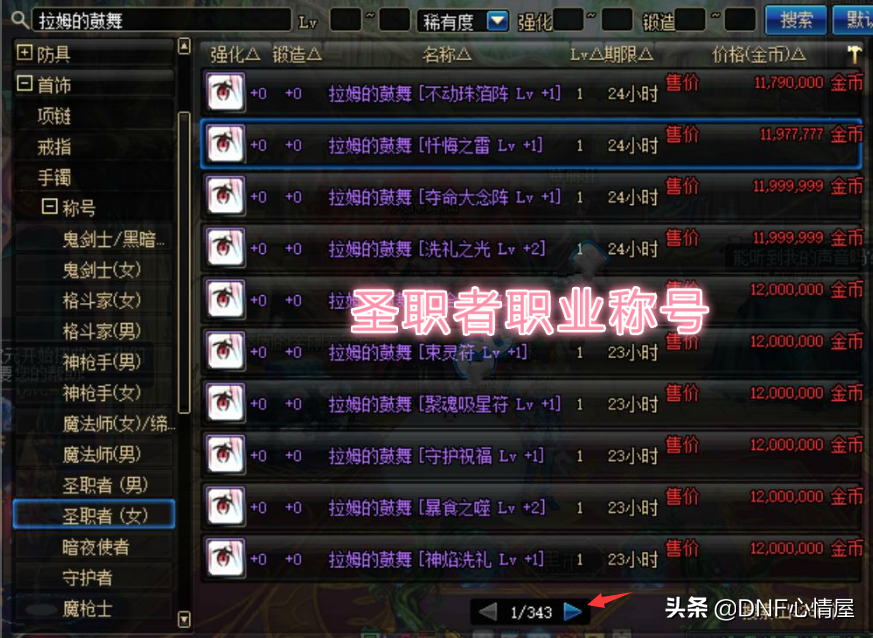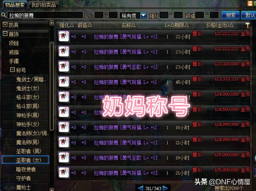 在跨六大区的拍卖行,足足有着343页圣职者(女)称号,然后,跳页功能依旧可以使用,再次找到奶妈的称号即可。虽说,这个方法要把拍卖行上的称号都过一遍,但却能精准的找到本职业的技能。对于一些拍卖行称号较少的大区,还是蛮不错的,像跨六942页,一遍一遍的翻,操作较为繁琐。