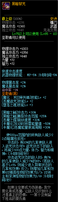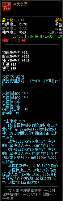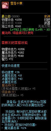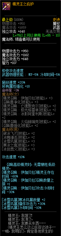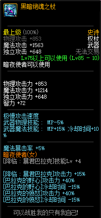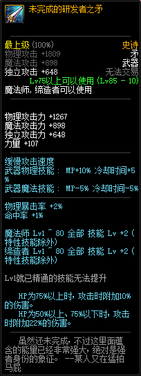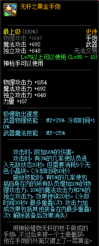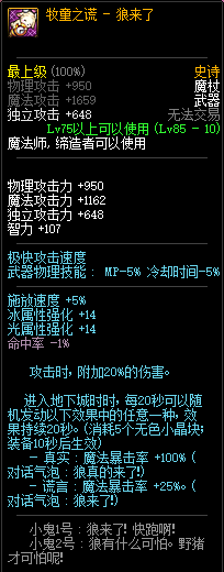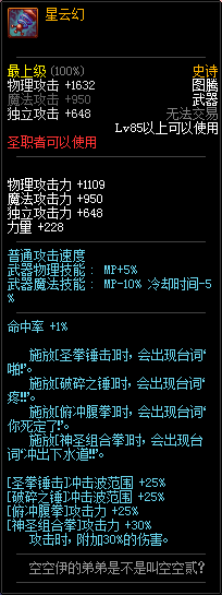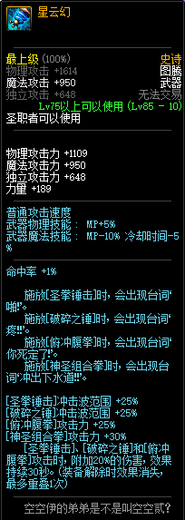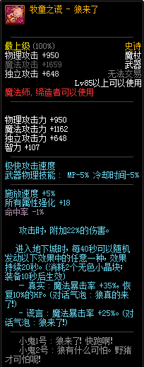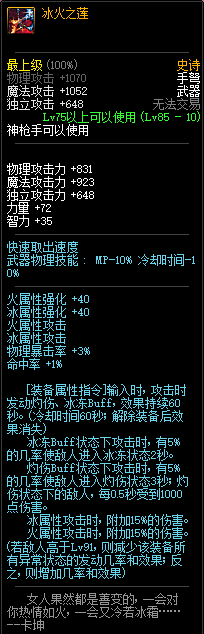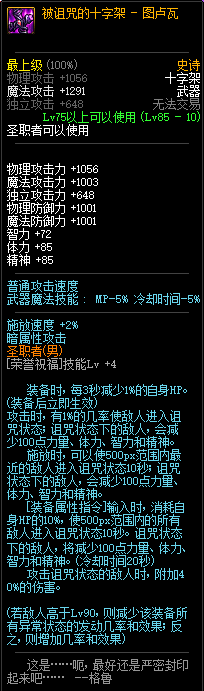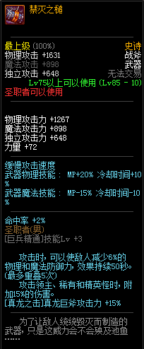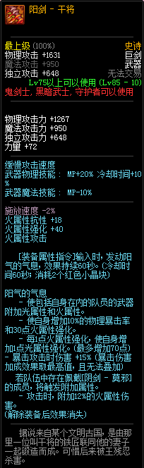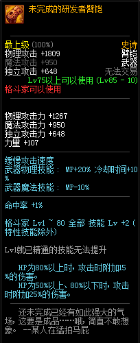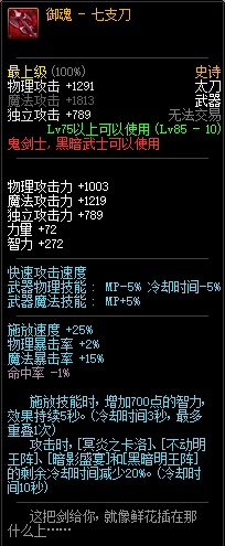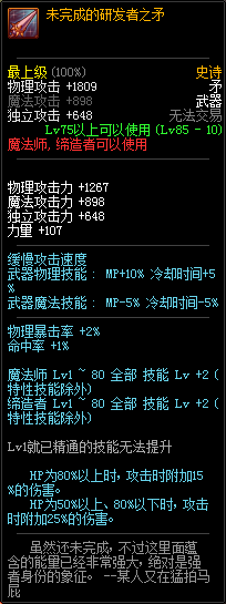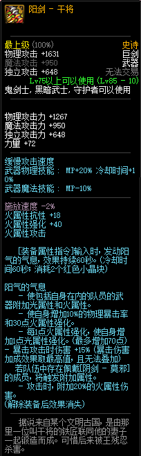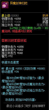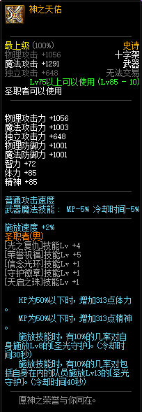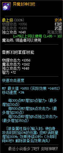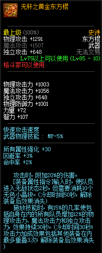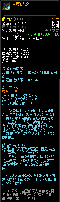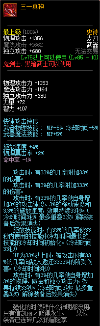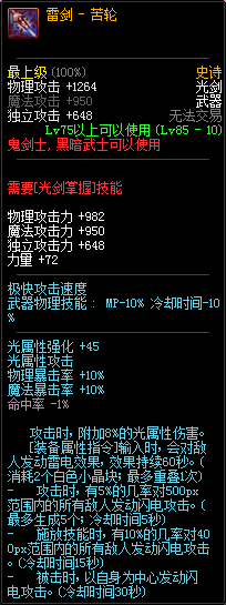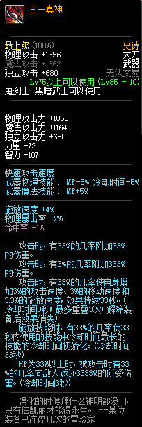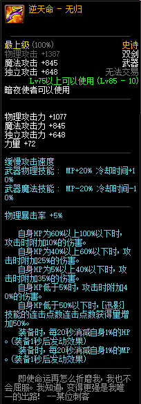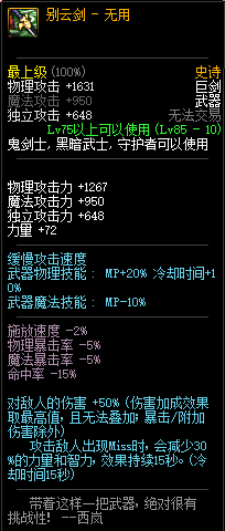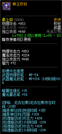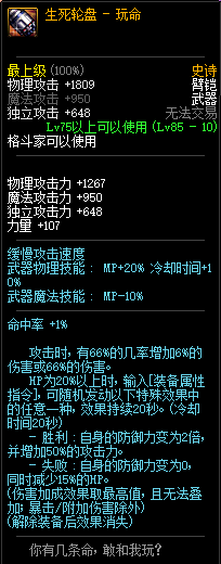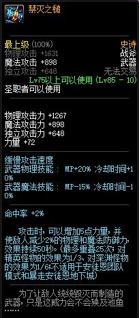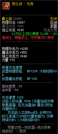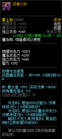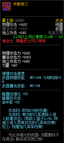 80级神器,曾经是力法职业玩家喜欢使用的一把武器。而这把武器热门的原因就是属性中设定会根据玩家HP值不同增加不同的力量和智力,最高增加150点,非常可观,而且攻击还有概率回血,并且自带回血功效,所以当时还是很受纯力法职业喜欢的。