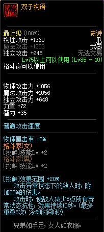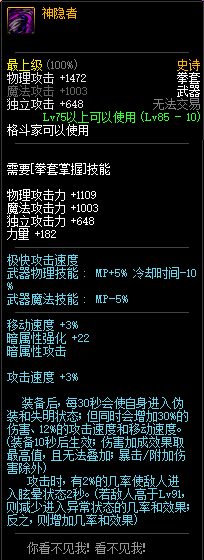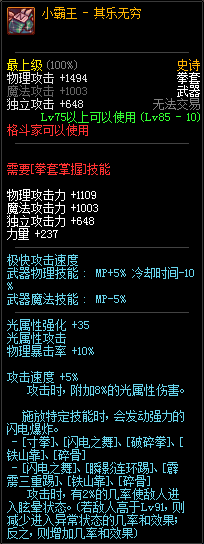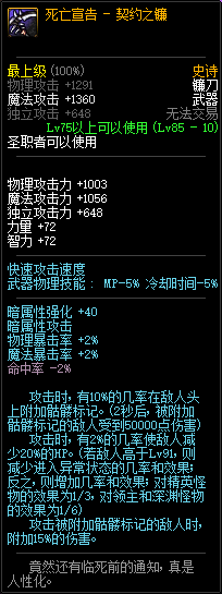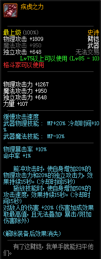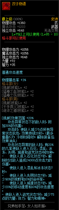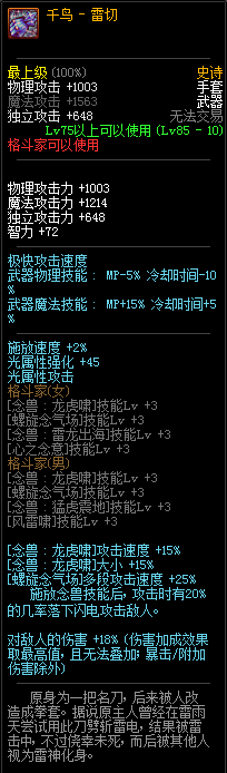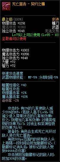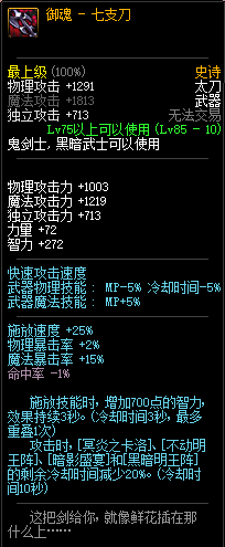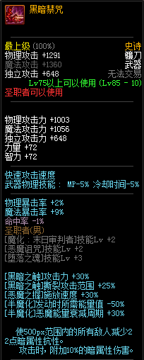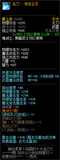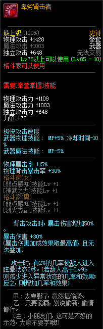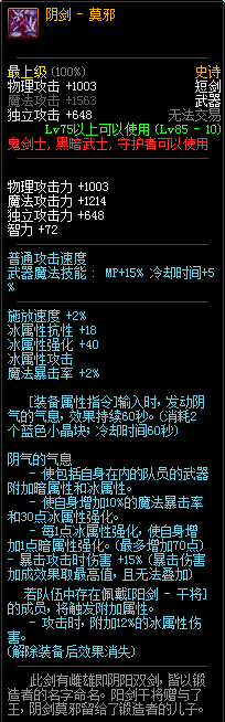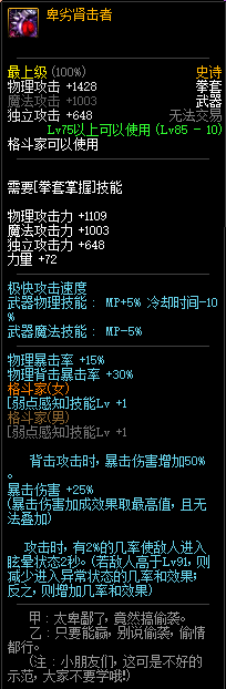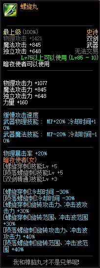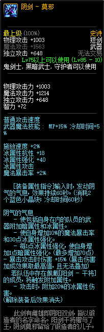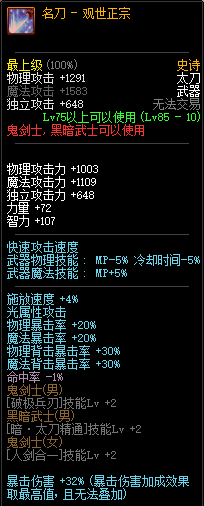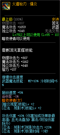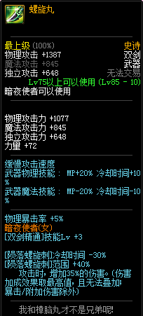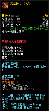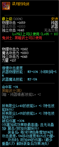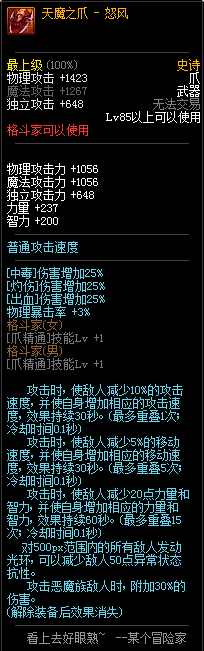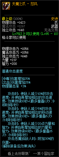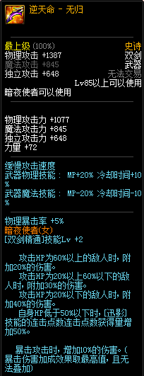 85级史诗,忍者职业的武器。其实关于这把武器的争议还是很多的,毕竟经过几次调整后,让玩家感觉大不一样了。当初这把武器是忍者高爆发的武器,而且也完美地配合异界套,忍者的毕业武器之一。