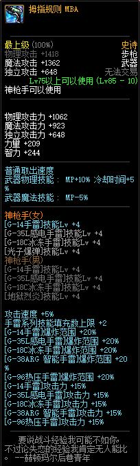 90级史诗,枪剑士职业武器。作为新职业武器,轮回之悖论也是比较不错的一把史诗,土豪玩家值得将这把武器高强,配合一些白字低的装备伤害比较可观。但是白字很高的时候,这把武器就不再适用了,因为收益减小效果就没那么好了。