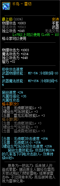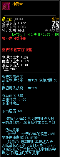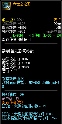 75级神器,暗夜使者武器。这把武器曾经也是暗夜使者职业比较热门的选择,价格一度也是非常高,但前提是需要【苦无掌握】技能,亮点是可以令【忍法:残影术】增加一个残影。