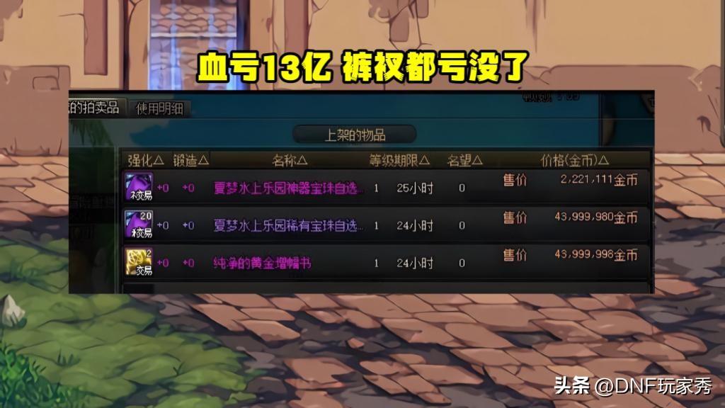 然后,把可交易道具“稀有宝珠自选礼盒*20”、“神器宝珠自选礼盒*1”、“黄金书*2”全部丢拍卖,回本9000万金币,损失了约13亿金币。