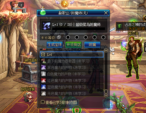 卡片生成宝珠我们需要自己的帐号中有附魔师这个职业,我们在菜单栏点击副职业后在出现的窗口中我们看到有生成宝珠选项,我们点击这个按钮就可以进入卡片升级界面