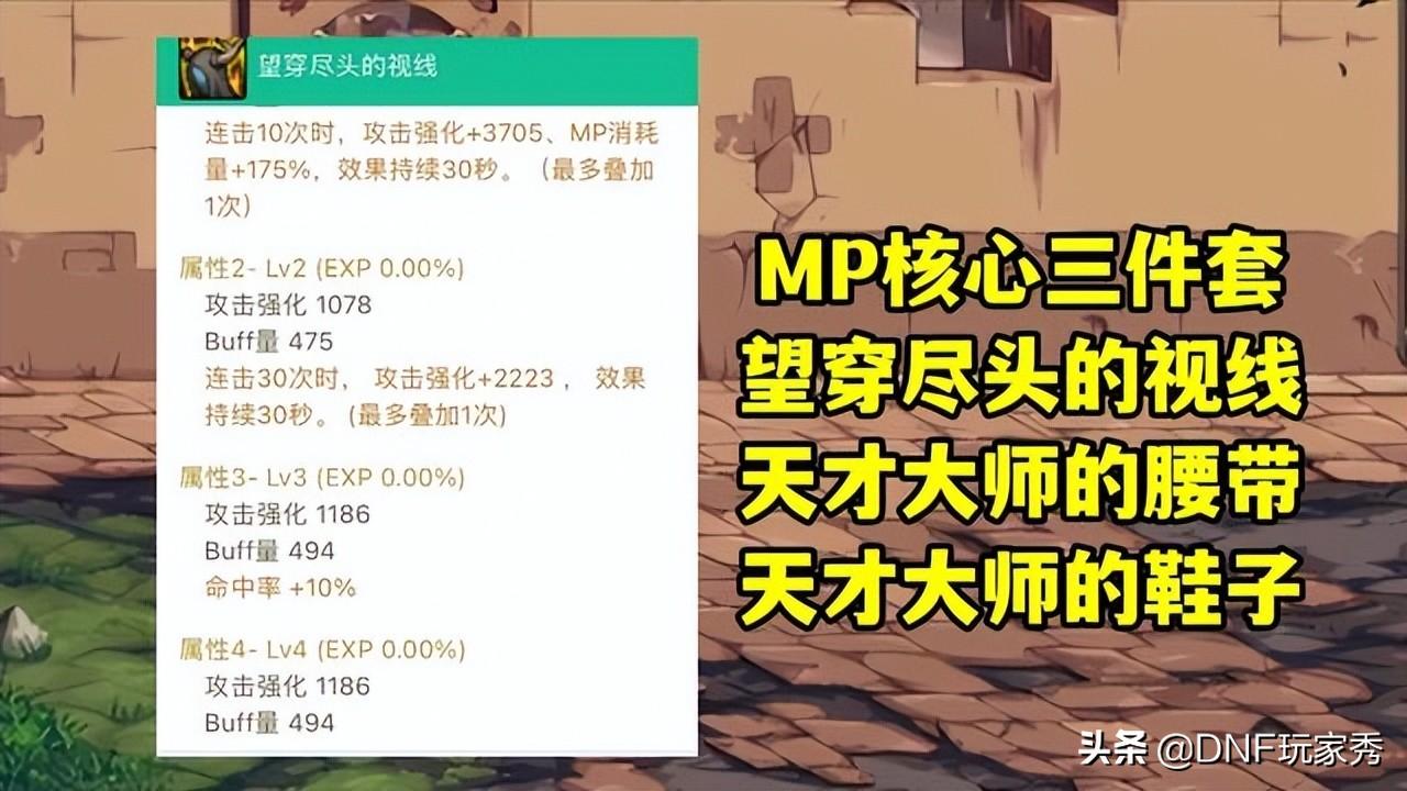 MP套系列的核心三件 :“望穿尽头的视线、天才技术大师的百宝腰带、天才技术大师的加厚长靴”,鞋子最大值25%技能攻击力加成,让这个三件套成为了防具核心。