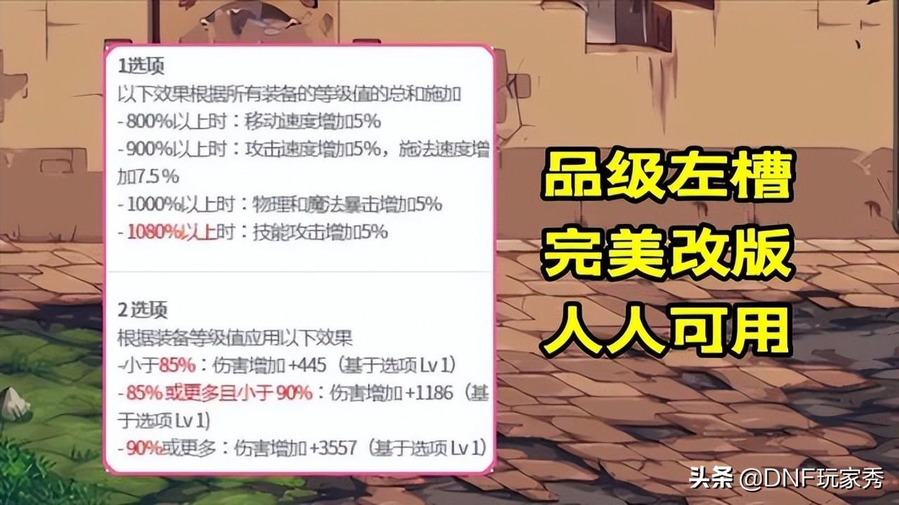 左槽部位,“附魔左槽”的提升太小,很多大佬都在用青面修罗,但是,在机械战神副本有巨大惊喜,产出新的强力左槽装备:“品级箱左槽”,最初设定要求12件装备的平均品级值95%,要求非常高,不过,韩服已经正式改版,只需要平均值90%,就可以全额触发。强烈建议兄弟们,立刻参与助手编年活动,每个月领取300个品级箱。