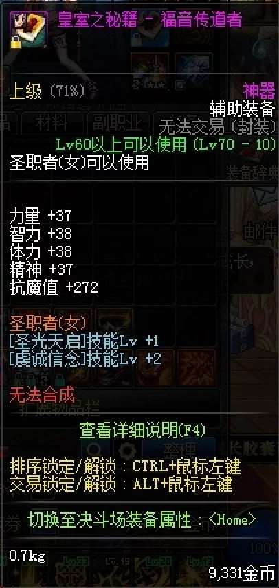 防具部分剩下的4个位置直接购买70级的圣物板甲套装即可,又是1级圣光天启和一觉被动增加,需要注意的是必须购买圣物,传承的话需要5件套才有效果。