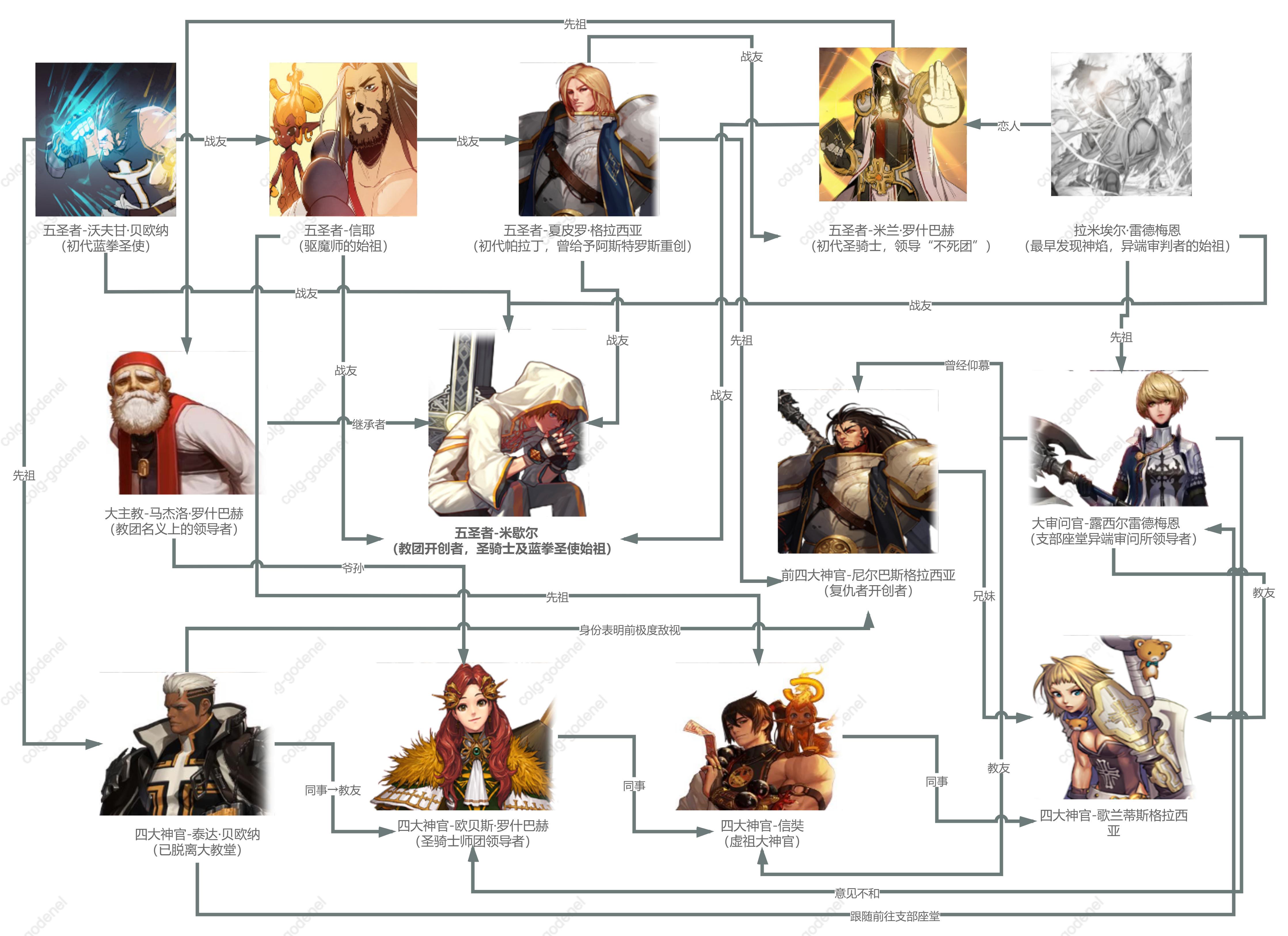 圣职者教团由米歇尔在暗黑圣战中创建,暗黑圣战结束后实际领导者变为米兰·罗什巴赫。当代教团的主要领导者们都是五圣者的后裔。暗黑圣战最后关头米歇尔将教团交付给五圣者之一的米兰·罗什巴赫,虽然米歇尔承诺回归但是实际上一直坚守在黑色大地直到获得希洛克的种子后离去。露西尔·雷德梅恩和欧贝斯·罗什巴赫现如今在剧情中再次如其先祖一样陷入命运的纠缠(橘势大好)。
