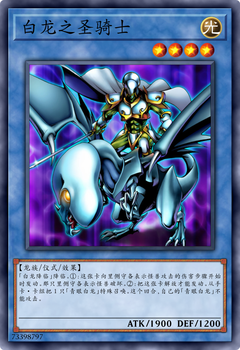 【白龙之圣骑士】最后放1张白龙之圣骑士供大家来做对比。卡图上的这两条龙除了颜色上的不同之外,形体上大致上都是一致的。这张白龙之圣骑士身上青眼白龙的元素很明显,能够让人一眼就能联想到青眼白龙。但是黑龙之圣骑士给人的感觉依然是像青眼白龙,这就很奇怪了。不由得让怀疑这到底是道德的沦丧,还是人性的扭曲。