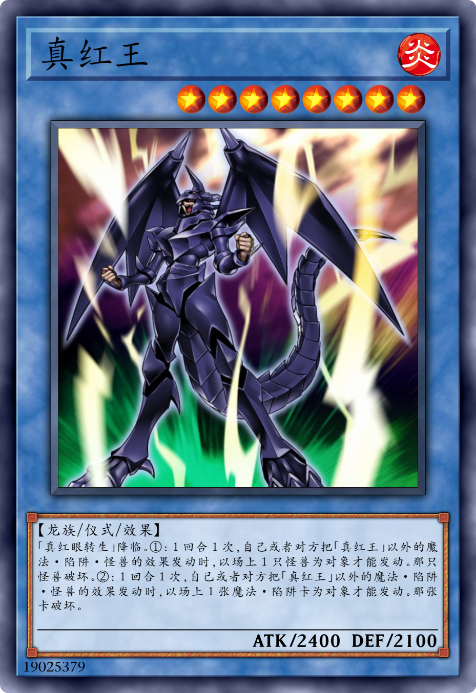 【真红王】在原作中这张卡是城之内将装备了斗气铠甲的真红眼黑龙作为祭品献上,而将真红眼黑龙变成装甲装备到了自己身上的结果。与其说是仪式,倒是更像是融合。因为城之内的对手巴隆使用的同样是可以把怪兽卡装备到自己身上的“盔甲怪兽”系列,这就让这一场决斗从卡牌游戏升级成了真人对打的决斗游戏,十分的燃。