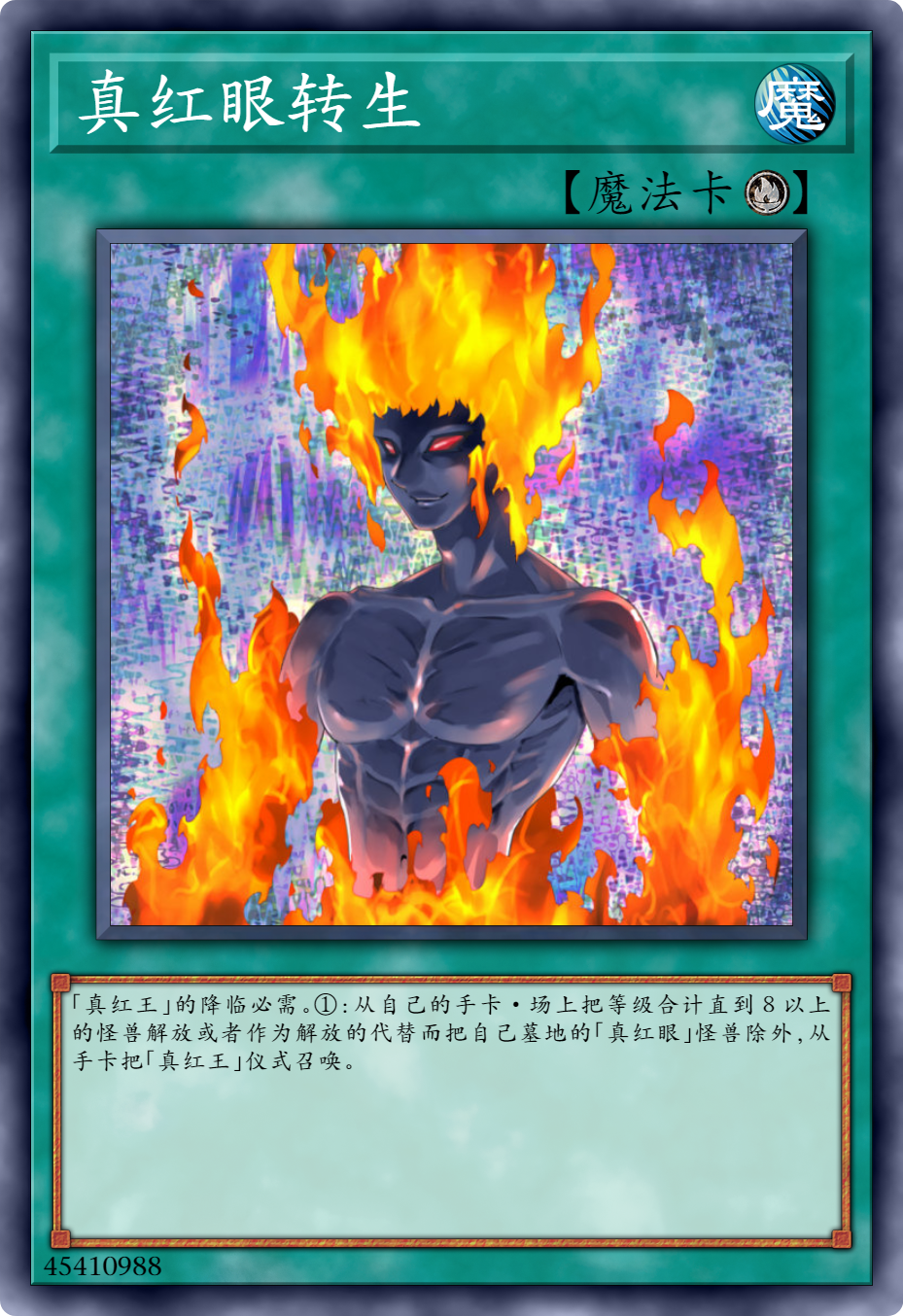 【真红眼转生】不同于黑魔术师和青眼白龙共用的仪式魔法【混沌形态】,作为御三家的真红眼直接被排除在混沌之外,由此真红眼系列内能够召唤真红王的仪式魔法卡,便只有这张真红眼转生。卡图上是一位沐浴真红之火的人类,但是众所周知真红眼黑龙的火焰为黑炎,这就让这张卡变得有点不伦不类起来。虽然能够明白想要表达的是浴火重生的意思,但感觉就是非常的敷衍。