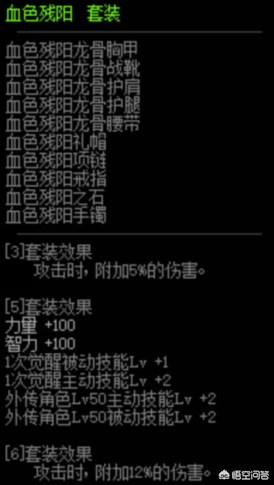 血色残阳套装提供了5%+12%的白字附加伤害,还有100点力量,并且主动技能配上辅助装备有3级主动,2级被动,这些加成对红眼来说做为过渡装备,伤害还是够用的。
