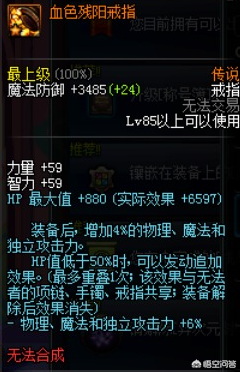 血色残阳三件首饰:戒指,手镯,项链,他们三个的属性都是一样的,装备立即提升4%的物理、魔法和独立攻击力。