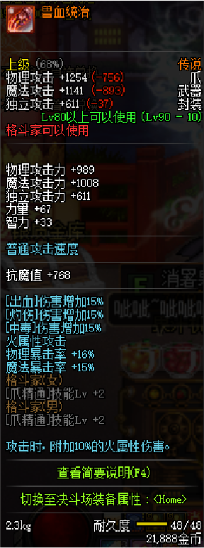 武器可以选择90传说爪兽血统治,增加15%的毒伤,为什么不选择刀疤之爪?因为黄暴对毒王来说加成不高,而这两把武器的价格是一样的,90传说基础更高一些。记住如果可以就买锻造8的,如果有材料就自己锻造就好了。