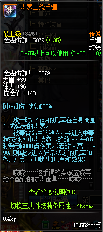 手镯的话依旧选择毒雾云绕手镯,中毒伤害增加20%,这也是毒伤流毒王必备的一件装备
