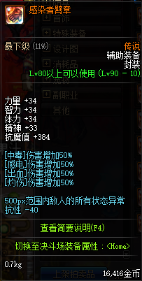 感染者臂章,各种神教流派必备的辅助装备,中毒伤害增加50%,没有这一件就不算真正的拍卖行战士了,并且还有40的减抗
