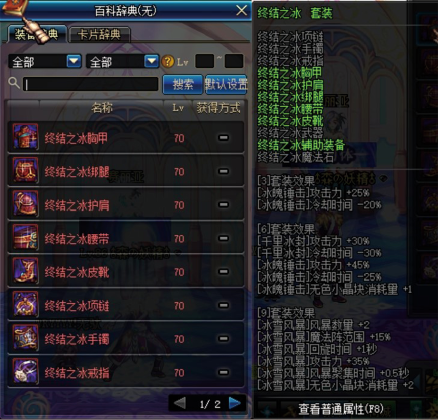 点评:冰结师大名鼎鼎的终结之冰套,这套既是现在冰结师比较主流的异界套装,而且作为支援兵也有着不俗的表现。45级大招的冰雪风暴在这套的增幅下多出两条风暴,同时增加了范围,用于支援兵无论是聚怪还是清怪都是非常好用的,配上精灵王的庇护更是再上一个台阶。