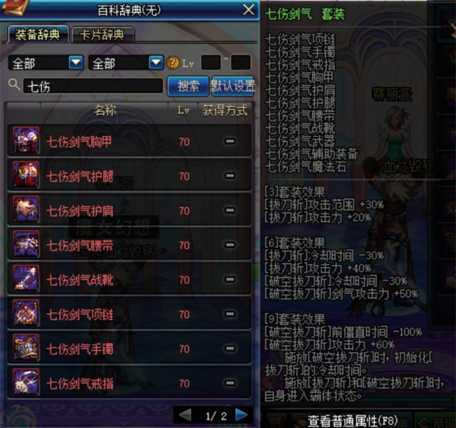 点评:几个版本前可以说是剑魂的主流装备,七伤6配金魂骨或者七伤9大小拔刀3连发都非常给力,但目前拔刀斩砍成狗....七伤前景并不太好,不过如果是搬砖的话,七伤是首选噢。作为支援兵,几乎可以一个小图一个拔刀,跑图效率还是非常好的,喜欢剑魂的玩家一定要做一套出来。