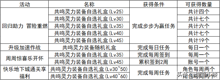 使用共鸣灵力史诗装备进行装备属性成长时可以获得全额的经验值,以下活动当中可以获取到共鸣灵力史诗装备礼盒。