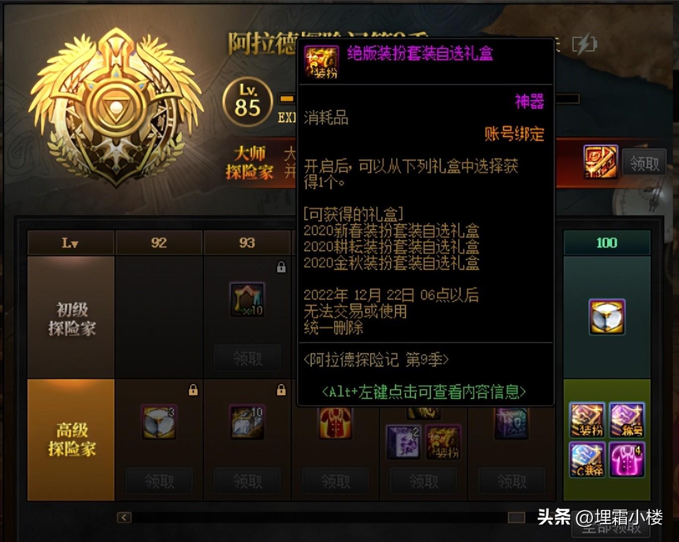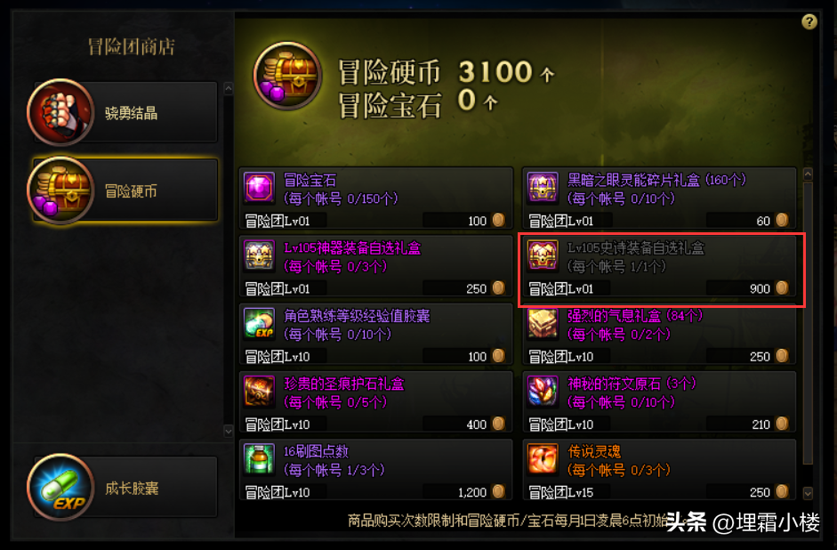 900个冒险硬币可以兑换一个Lv105普通地下城史诗自选礼盒,每月可以兑换一次。