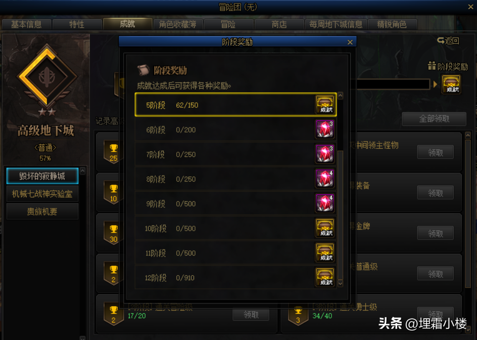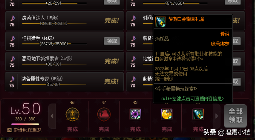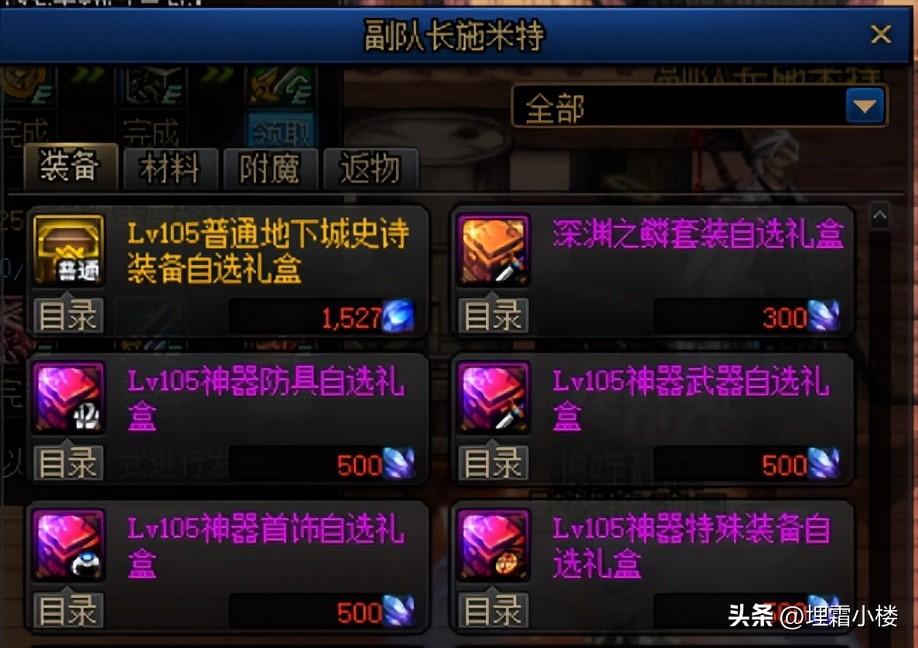 成就系统当中普通地下城、高级地下城和军团栏都有装备自选礼盒赠送,但是短时间内积累难度较大,需要勇士们持之以恒地参与副本。