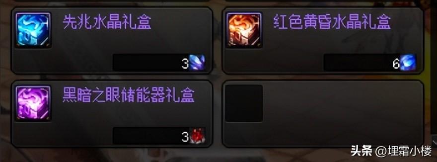 1527个先兆水晶可以兑换一个Lv105普通地下城史诗自选礼盒;400个红色黄昏水晶可以兑换一个毁坏的寂静城或贵族机要史诗自选礼盒;400个黑暗之眼储能器可以兑换一个机械七战神实验室史诗自选礼盒。