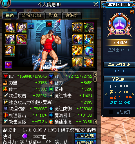 上图为佩戴三神器之后的站街面板,智力为3434,独立攻击力2393,别问为什么独立这么低,我只能告诉你审判奶基本就这水平。