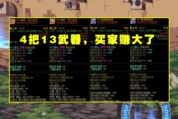但其实这位玩家能卖出1166的价格,并不是拥有一把红13武器,而是拥有3把,其中还有一把白13,而且均打了15属强,关键的是4把13武器还都是遴选毕业的,两把手炮一把30词条,一把16词条+2级觉醒,拥有4把13武器也难怪卖这么高,这哪是号主赚大了,明明是买家赚大了,4把13武器才1166R,如果能不找回,想想都能笑醒,拿来追命冲击14,要说成了更是血赚。