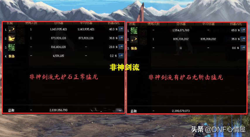 在对比过程中,我们也得出了一个结论,神剑流猛龙护石,提升率比非神剑流,要多10%的伤害。