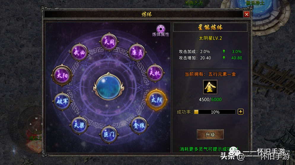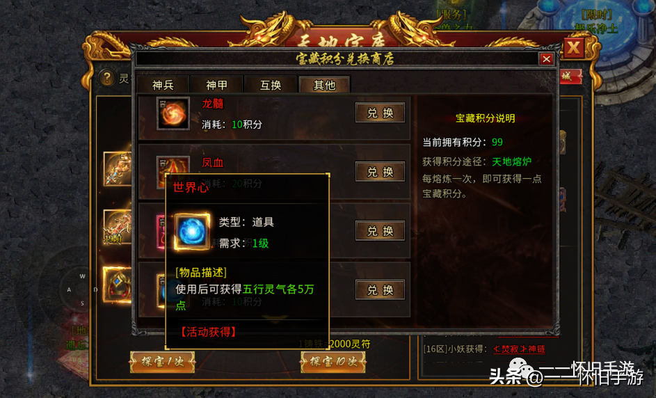最后一个就是星能炼体了,这个优先点下面一半蓝色的,都是百分比加成,每天上面的参悟可以点一次能得到元素的,然后还有个隐藏窗口,在天地宝库的兑换里面有个世界心,一个能所有元素加5W,只有这两个地方能得到元素其他地方没有的