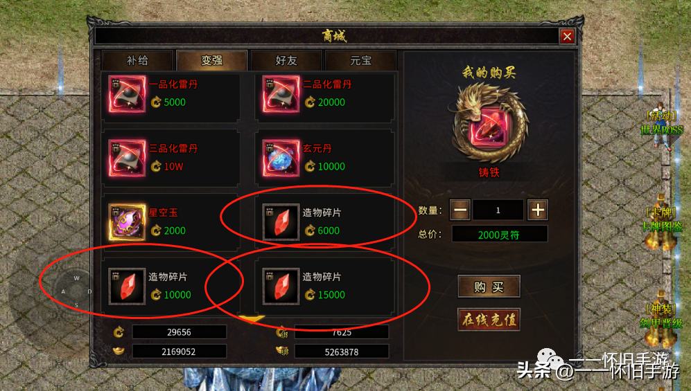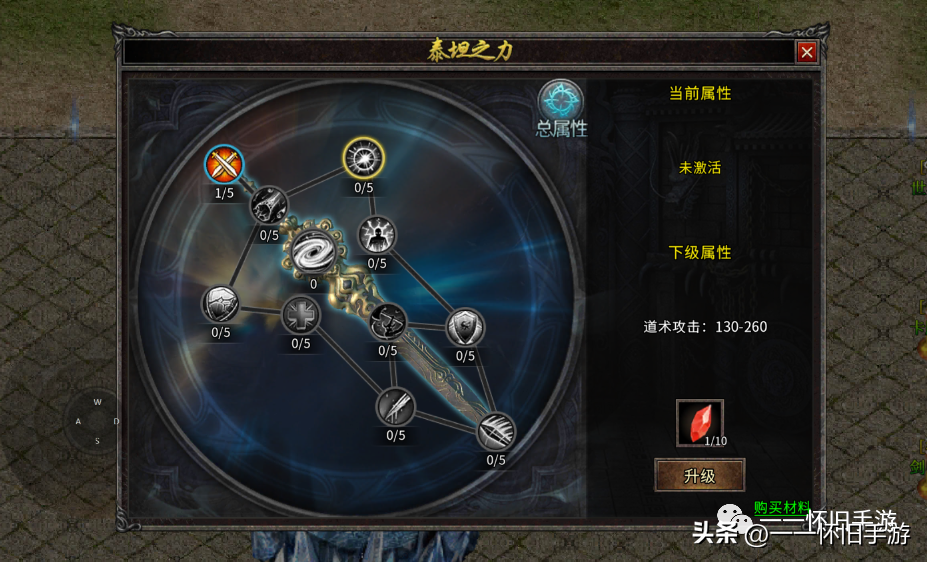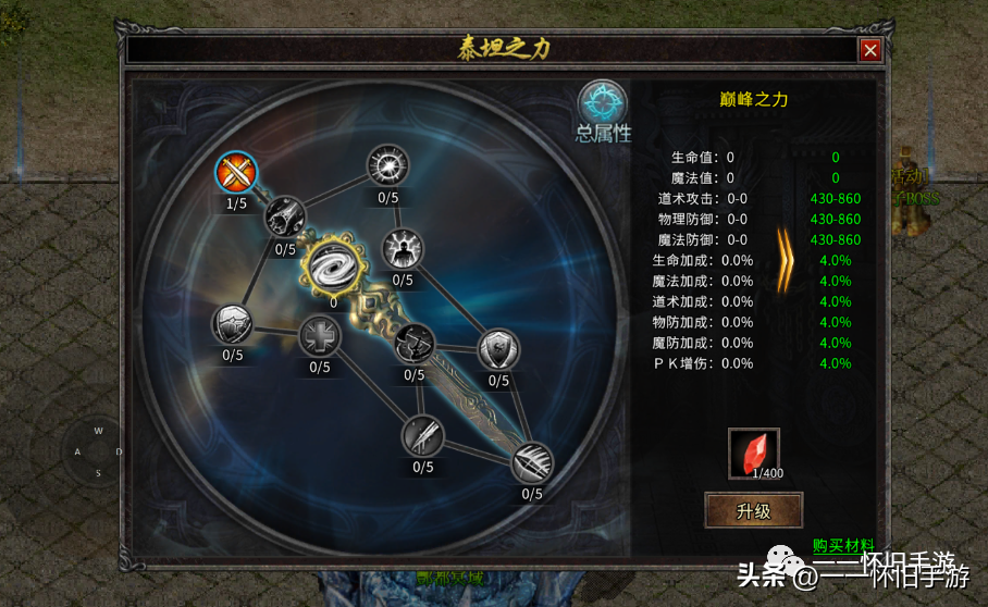 第三个就是泰坦之力,二大陆正上方就能看到,然后材料在商城内每天元宝限购5个,前面只要10个就能点一下,有的大佬可能忽视了,直接灵符就买了,这个不要强求,因为越往下面点要的数量越多,最后一个要400个才能点一个,不过属性也是相当可观的