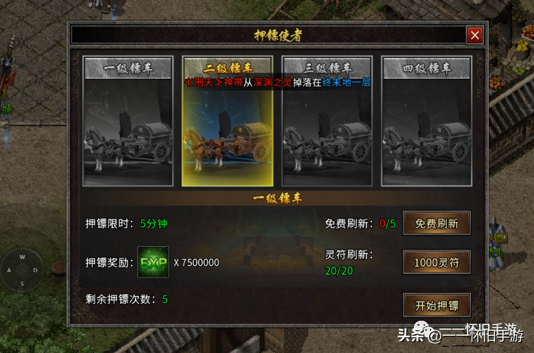 第一个 就是押镖,开区第一天只要到4转立马上二大陆往右下角走就能看到了,登录游戏送三档赞助直接就3转了,vip任务做几个就能到4转,不难的,押镖四级镖车直接两千万的经验,第一天能升好几级
