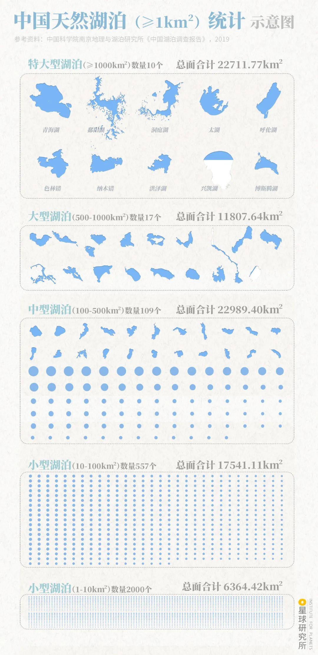 (上文数据据王洪道等《我国的湖泊》&中国科学院南京地理与湖泊研究所《中国湖泊调查报告》,因统计时间、方法差异,湖泊数量、面积等信息不同资料存在差异;中国天然湖泊数量及面积统计,第50个湖泊后由圆点代替,并非湖泊本身形状;制图@赵榜&陈思琦/星球研究所)