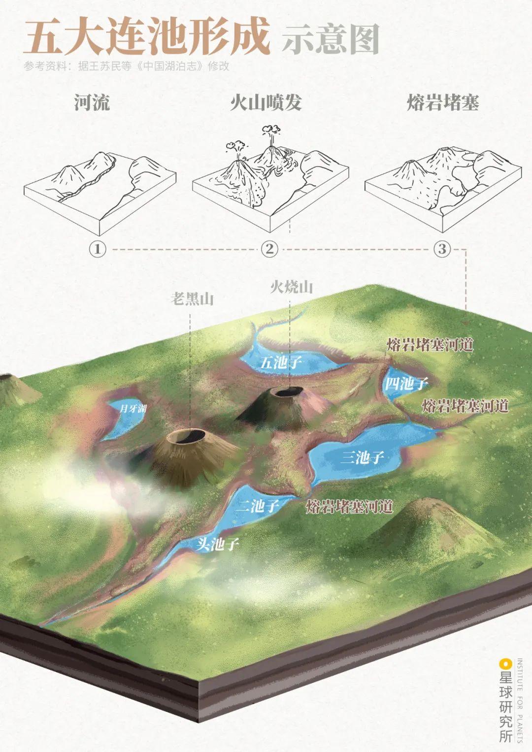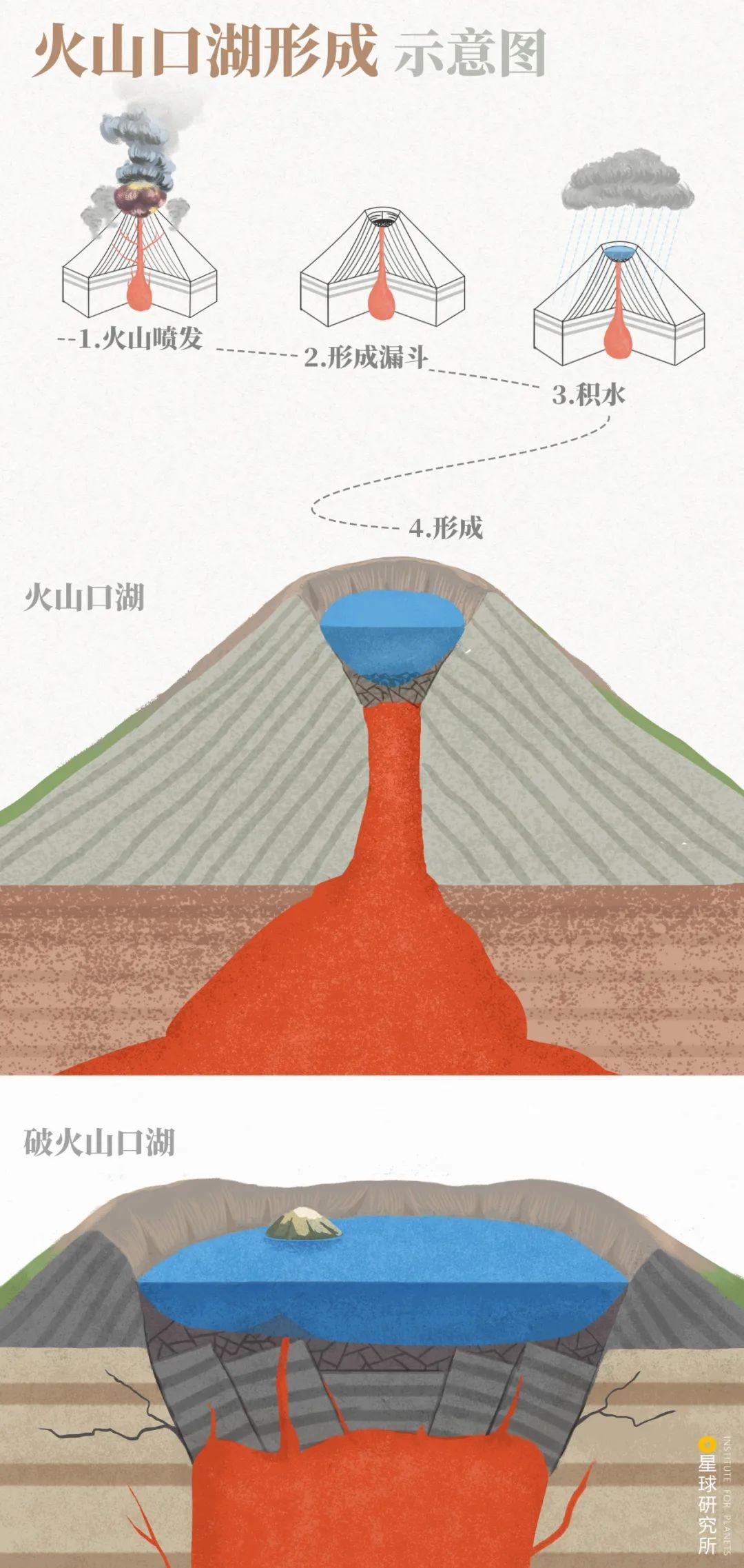 (火山口湖形成示意;如果火山多次喷发,早期火山锥发生断层沉降,则形成破火山口湖;制图@赵榜/星球研究所)