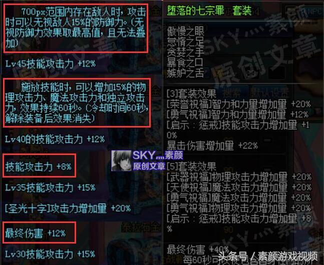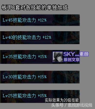 上衣对45级技能 增加12%的攻击力,下装对40级技能 增加12%的攻击力,护肩对35级技能 增加15%的攻击力,腰带对30级技能 增加15%的攻击力,鞋子 对20级(装备描述为25级,实际效果却是20级) 技能增加15%的攻击力。由此可得板甲B套对20级-45级各技能的单独提升率: