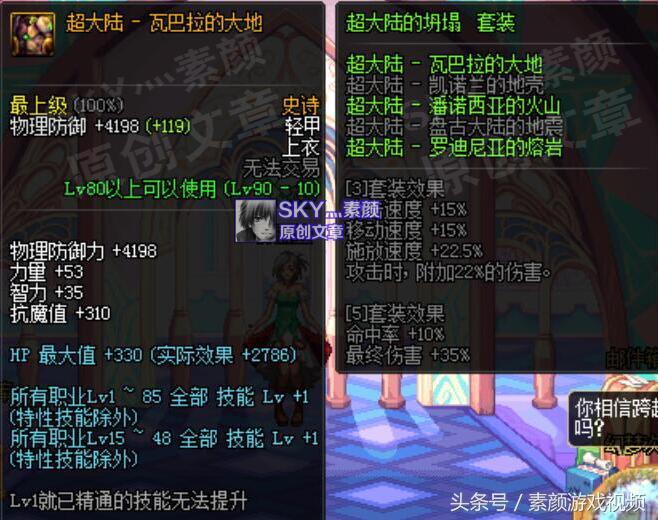 布甲苍穹之云套装下的装备属性: 追加黄字伤害38%,追加暴击伤害73%,力智加成44%,三攻加成18%,最终伤害80%,白字附加伤害58%。