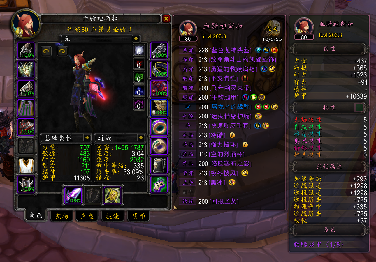 下图是惩戒骑的装备,这身装备是随意搭配的,有些装备还需要好好调整一下,可以看到命中等级有些溢出,正常情况下惩戒骑的命中等级需要263点,祥子哥的惩戒骑现在是335点。原本命中等级是刚刚好,上周拿到了黑冰武器,命中等级才严重溢出。本周打25人团本时,替换一两件装备,就算是一个合格的惩戒骑(请忽略空的烈酒杯),打10人和25人团本应该没有问题。