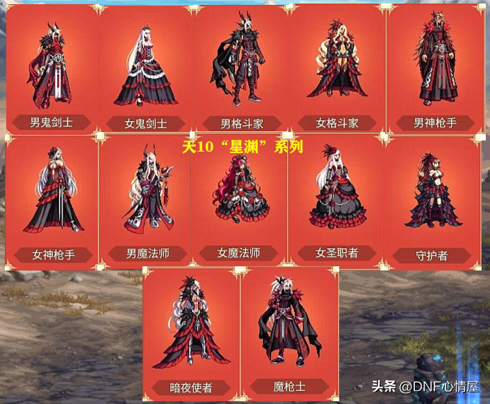 “星渊”天10装扮,部分职业外观,还是非常好看的,比如魔枪士、女圣职者、守护者、女鬼剑士等等,都具有很高的评价。