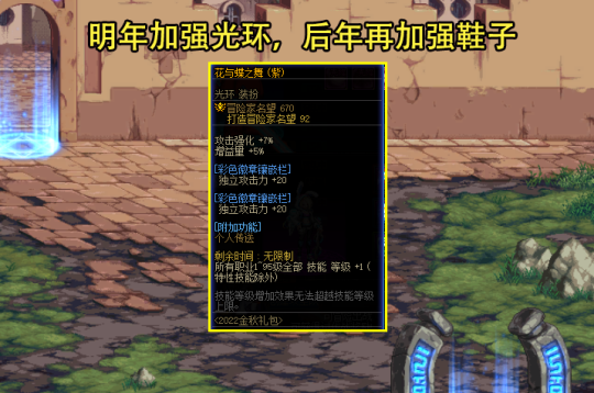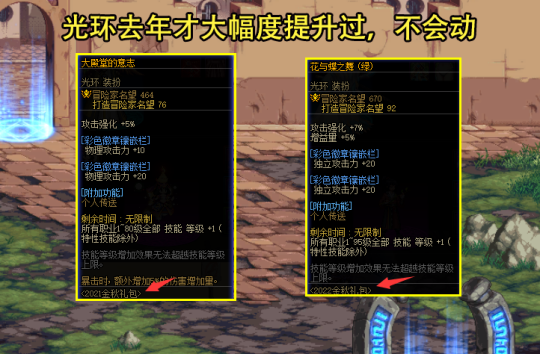 首先,去年的国庆光环才加强过,而且加强幅度非常大,直接从5%的攻强、1~80技能+1,改成了7%攻强、1~95技能+1,提升幅度高达9.5%。按照20~21年光环属性2年未变来看,由于22年的金秋光环才时过1年,所以23年金秋光环大概率也不会变。而光环如果属性不变,那么就只能对腰、鞋宝珠动刀了,不然2大卖点属性保持原样,玩家也没有买的理由。