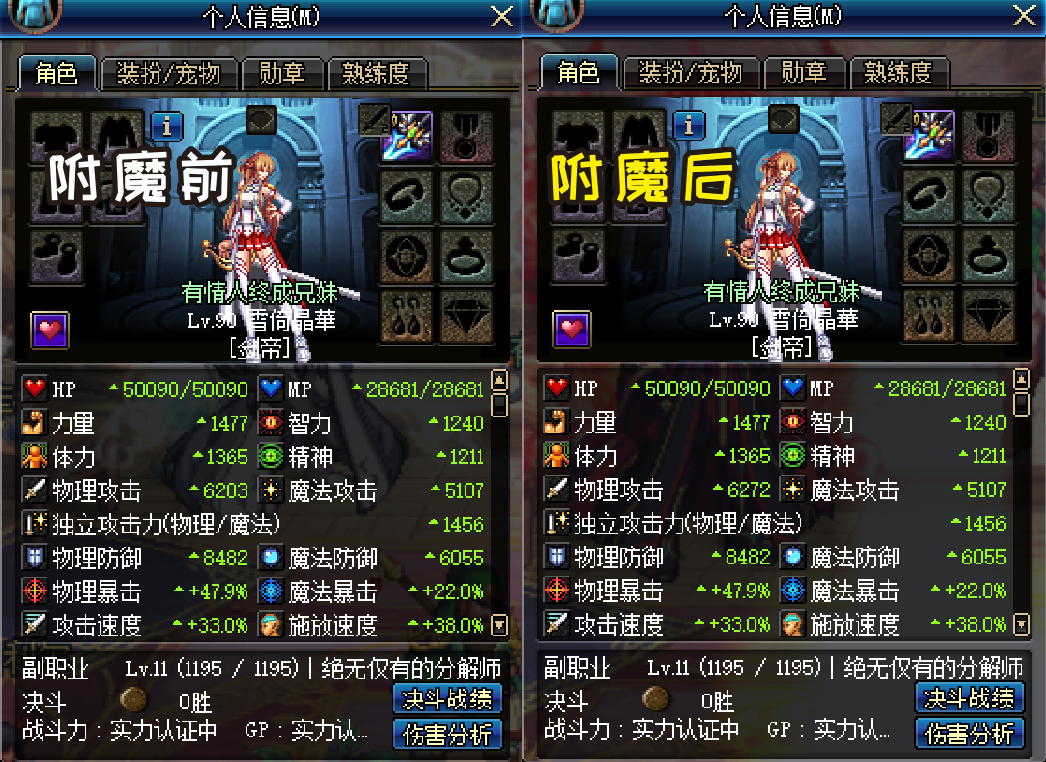 我们先不管力量的提升具体计算公式是怎样,我们仅看现在我们在剑帝只带一把武器,装备为0的情况下,我们附魔力量和物理攻击力提升面板物理攻击的对比
