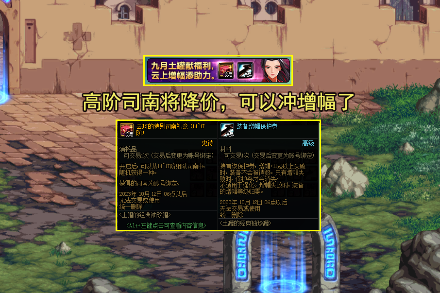首先,魔盒加入的2个道具,分别是云珂的司南礼盒(14~17阶),以及装备增幅保护券,2大道具都是可以交易1次的,至于开启概率未知,不过在这两个道具加入之后,14~17阶的思南门票要降价了,玩家也可以冲身上的装备了,有打高阶司南,或者想要冲高增幅的玩家,可以等到9.7再弄也不迟 ,到时候可以省下不少钱。